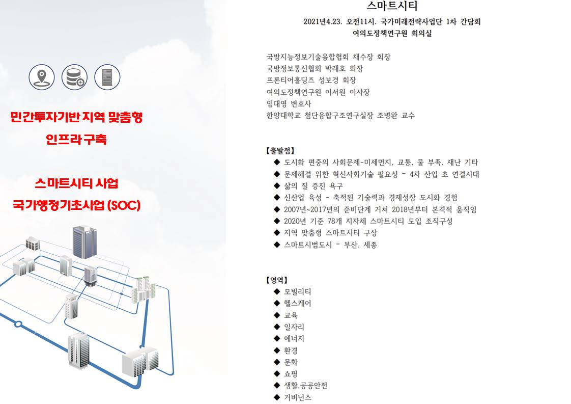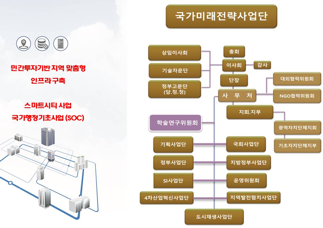 스마트시티-SOC사업(사회간접자본)을 위한 ‘국가미래전략사업단 발족식’이 지난 7월 9일 여의도 이룸센터에서 개최됐다.이 날 발족식에는 여의도정책연구원(원장 이궁), 프론티어M&A(회장 성보