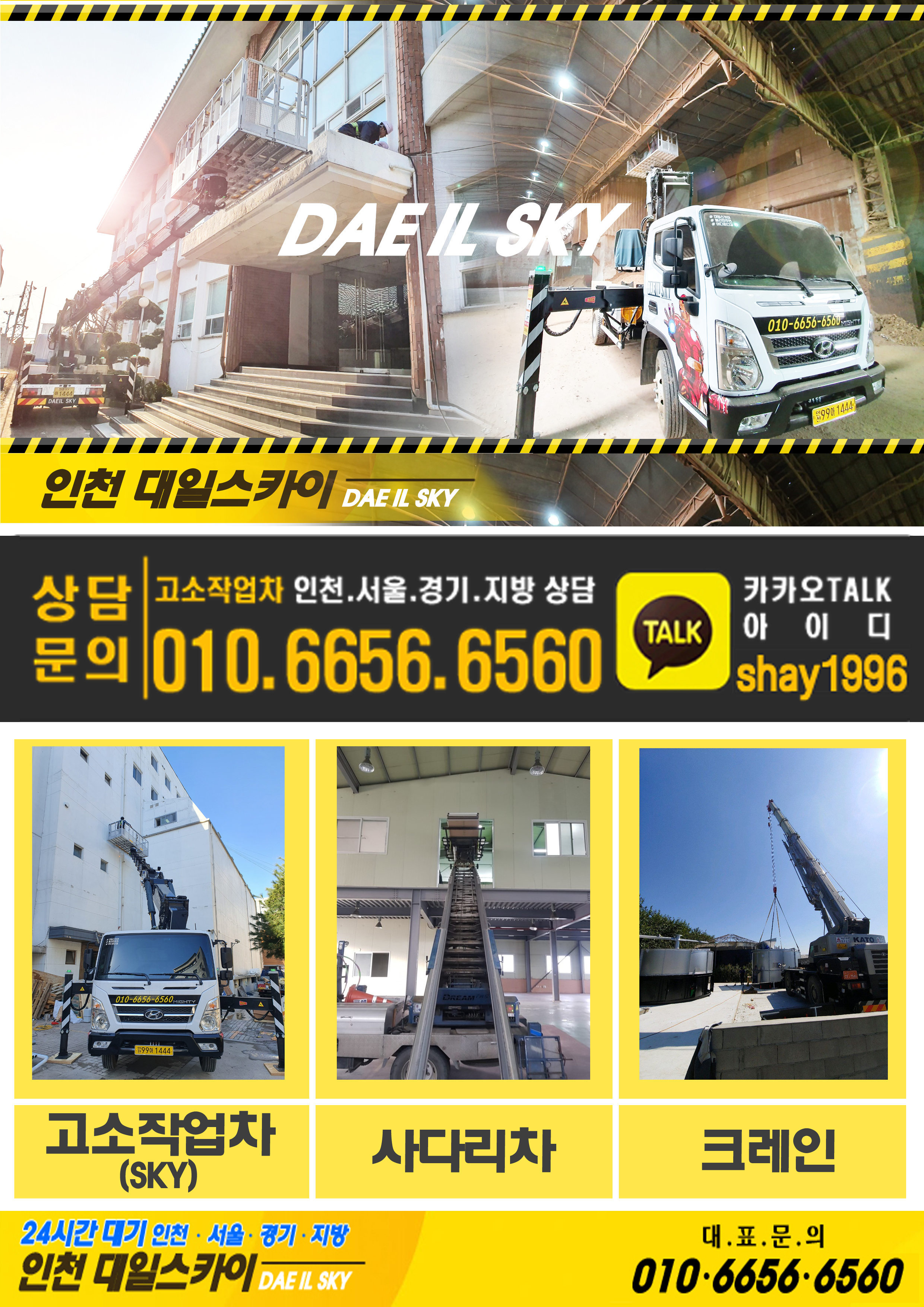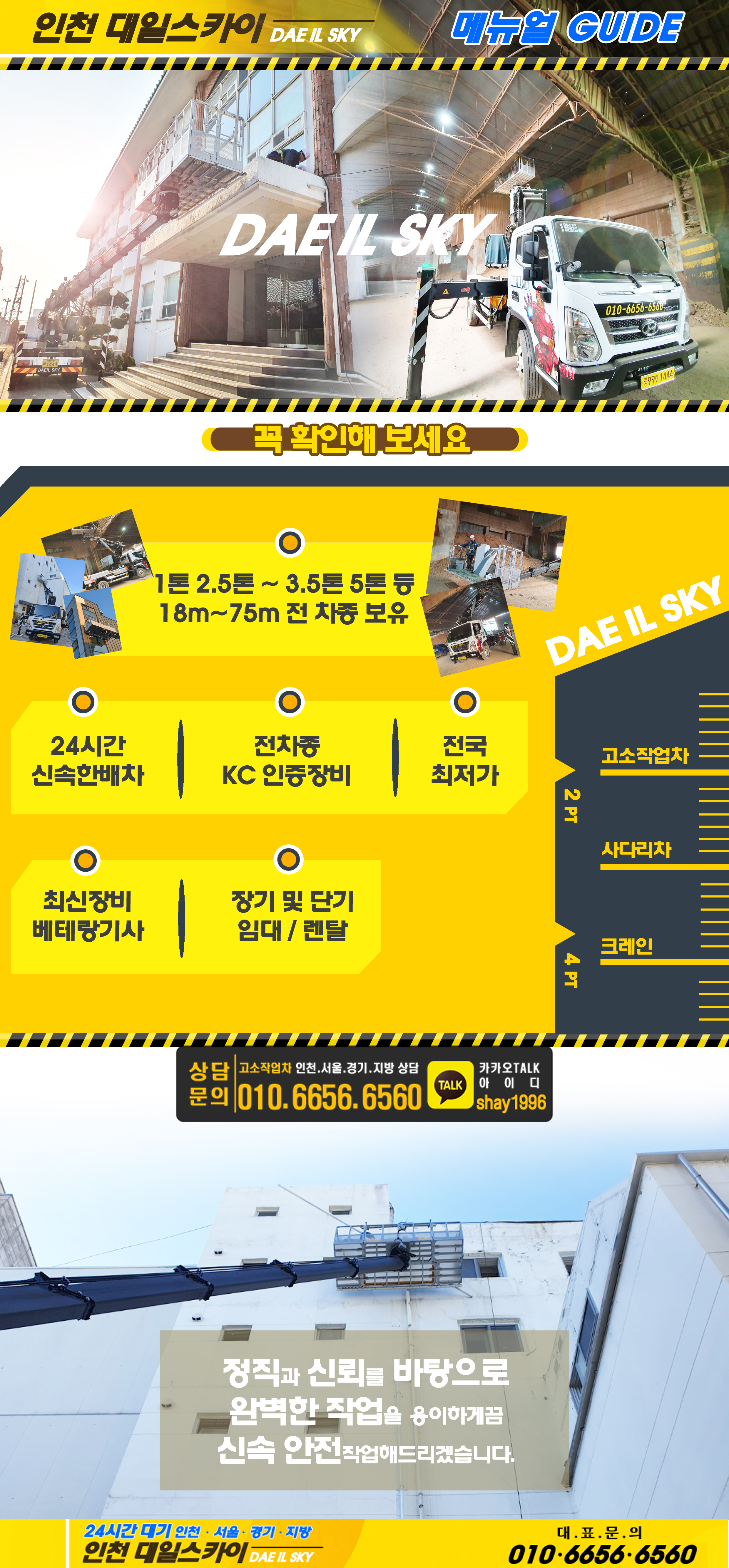 믿음과 신뢰를 최우선으로 하는 대일스카이입니다. 각종 최신 인증스카이장비 베테랑, 기사님들 항시대기중 ☎ 010-6656-6560